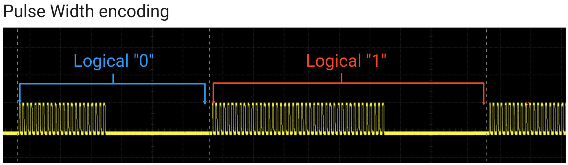 PWM 방식의 경우는 "SPACE"를 Fixed time 길이로 고정하고, "MARK"의 길이를 다르게 적용하여 논리 1,0을 표현한다.