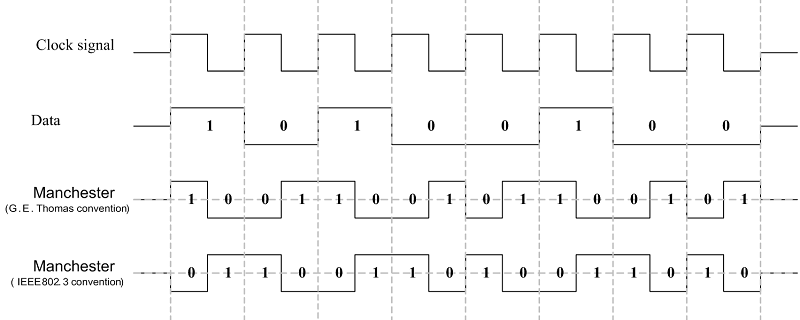 즉, Manchester Encoding 에서의 논리 0과 1은 다음과 같이 표현된다.