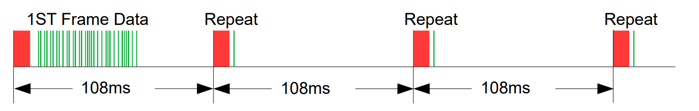 NEC 프로토콜을 따르는 IR 신호의 프레임 길이는 38Khz 기준으로 108ms 로 고정되어 있으므로